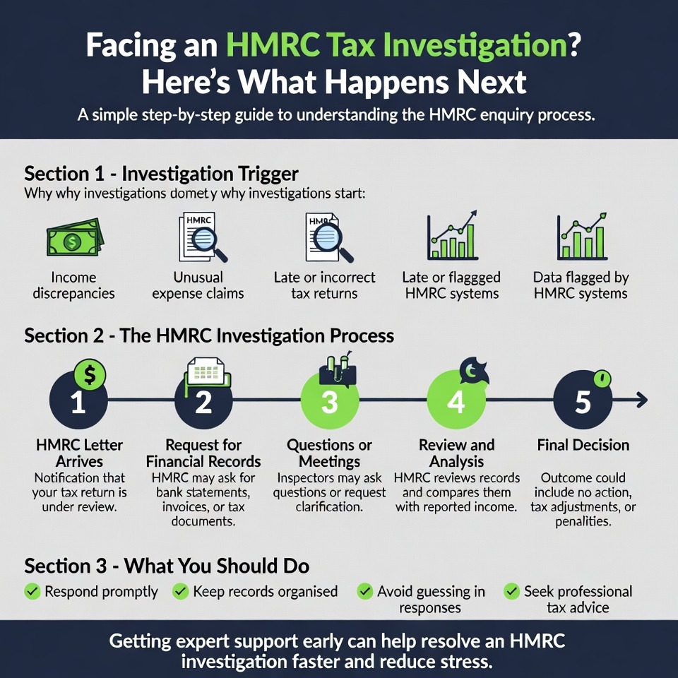 It could be random HMRC runs routine checks on a percentage of tax returns every year. Or it might be triggered by something specific: unusually high expenses, significant income changes, discrepancies between your return and third-party data, or working in a sector they’re currently targeting. Being investigated doesn’t automatically mean you’ve done something wrong.